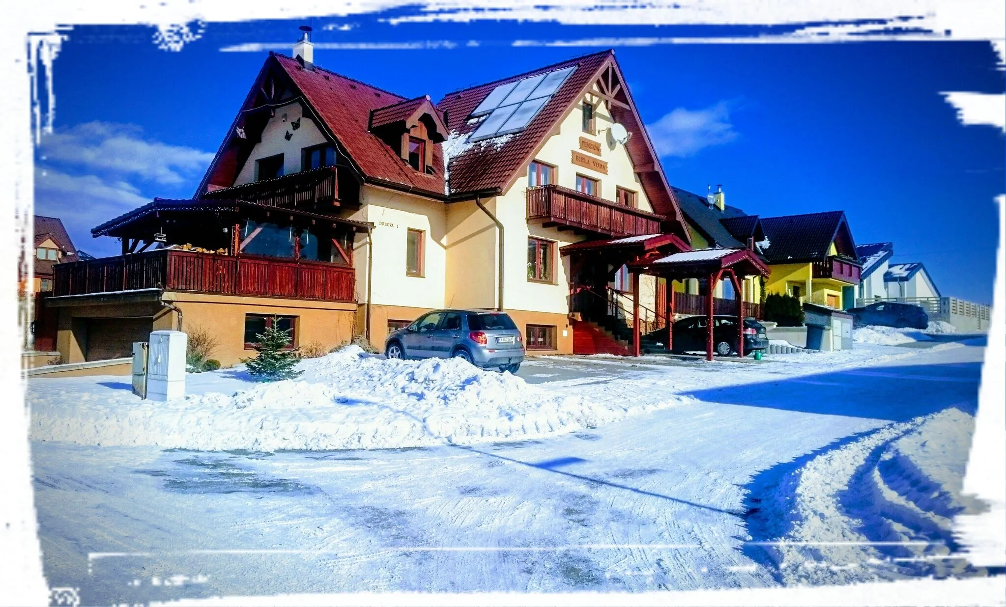 Pôsobíme v podtatranskej obci Veľká Lomnica. Nájdete u nás ubytovanie v komfortných, účelne a príjemne zariadených izbách s kúpeľňou so sprchovým kútom a WC. V celom penzióne je 24 hodín denne k dispozícii bezdrôtové internetové pripojenie WIFI. Každá izba má vlastný SMART televízor s Netflixom zdarma a chladničku. V objekte sa taktiež nachádzajú miestnosti s biliardom, stolným futbalom, šípkami, stolným tenisom a súkromným kinom. Z objektu je prekrásny výhľad na panorámu Vysokých Tatier, Nízke Tatry, okolitú prírodu a blízke sídla. Lokalita poskytuje veľa možností výletov do tatranskej prírody alebo za kultúrnymi pamiatkami